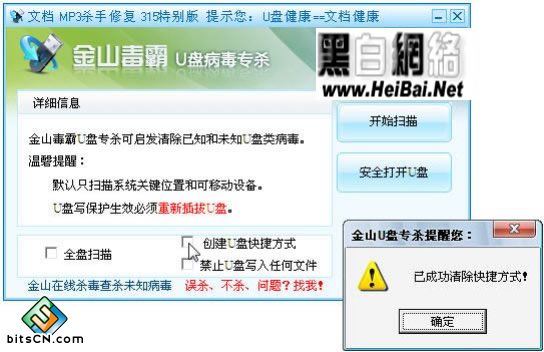 金山U盘病毒专杀提供的“创建U盘快捷方式”用于帮助用户轻松创建安全打开U盘的快捷方式,如图所示,用户只需勾选“创建U盘快捷方式”选项即可轻松创建U盘快捷方式。