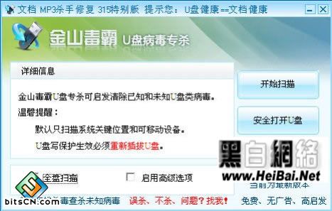 金山U盘病毒专杀可启发清除已知和未知的U盘病毒,用户只需点击界面右侧的“开始扫描”按钮即可运行扫描程序,如图所示。