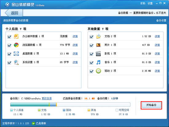 第二步:备份数据。可以快速备份QQ、MSN、旺旺等聊天记录,我的文档、桌面、IE收藏夹、邮件等重要个人数据,确保永不丢失,重装完成后可进行还原。