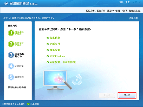 重装系统完成,电脑重启后进入桌面,自动启动金山装机精灵。点击“下一步”,进行数据还原。