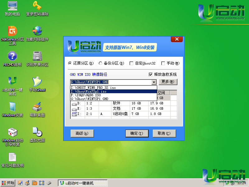 2、进入到pe系统桌面后,双击打开“u启动PE一键装机”图标,工具在被打开后会自动查找对应符合要求的系统安装文件。如下图所示:
