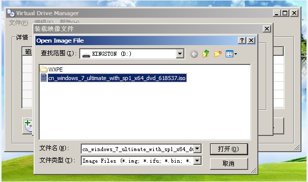 6、装载映像文件:点击装载,找到你的U盘上的ISO文件,路径浏览记住虚拟盘符为A,确定后,最小化放在任务栏边