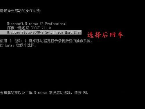 重启后出现开启启动项选择(如下图),请用键盘的↑↓→←键移动光标选择【Windos Vista/2008/7 STEUP From Hard Disk】 然后回车。