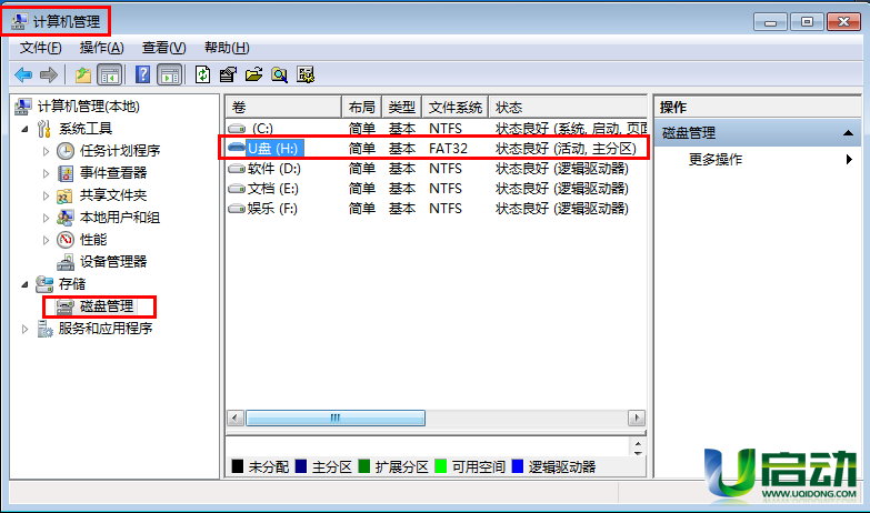 ①右键点击“计算机(我的电脑)”,选择弹出菜单的“管理”,打开“计算机管理”窗口,点击左边窗口中的“磁盘管理”,在右边窗口中就可以找到u盘;如下图所示: