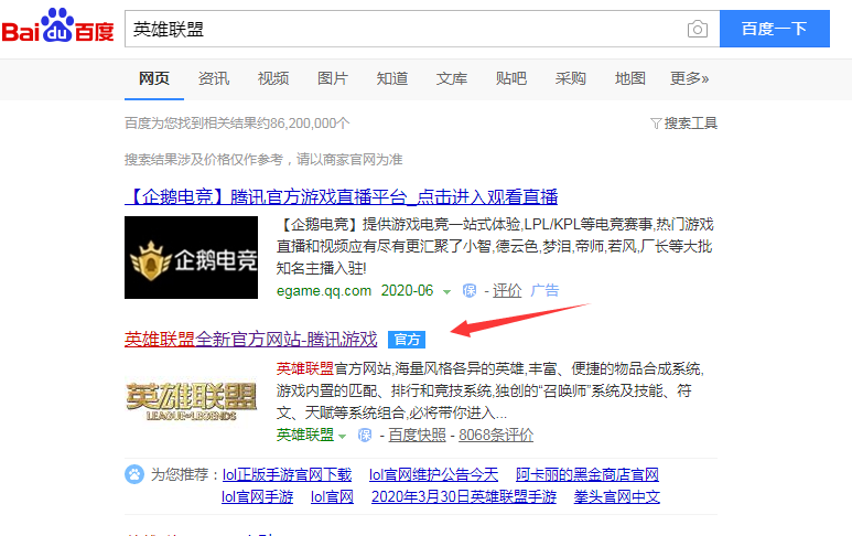 1、既然是想了解英雄联盟游戏的相关配置,那么一定要去英雄联盟游戏的官网查阅,我们可以直接通过百度搜索并打开英雄联盟官网,如图。