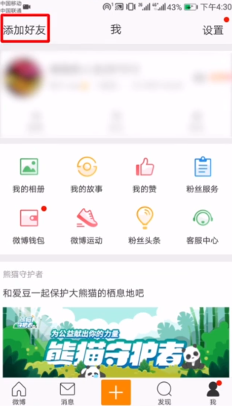 首先打开新浪微博客户端,然后点击右下角的“我”,再点击左上角的“添加好友”。