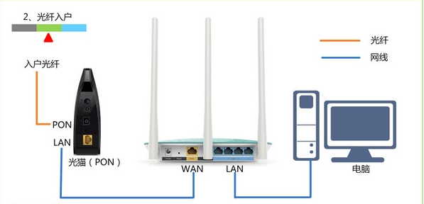 1.第一步将路由器和光猫以及电脑都连接上,如下图所示: