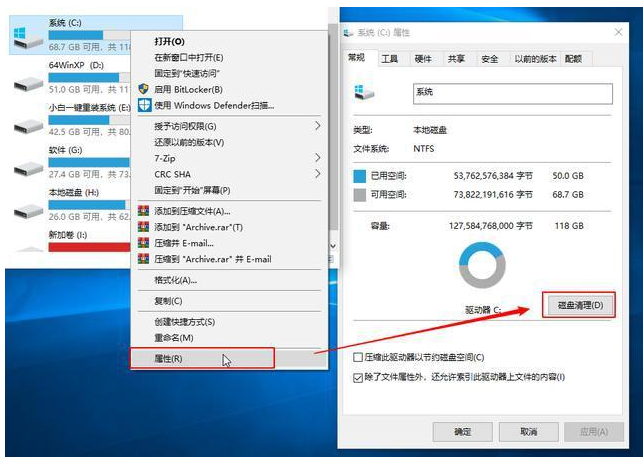 1.双击桌面此电脑进入资源管理,就会看到电脑硬盘使用情况。右击C盘,选择弹出菜单中的属性。下一个出现的窗口中点击磁盘清理按钮。