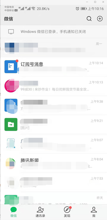 1、首先,打开手机上的微信功能,在“微信”窗口的顶部我们会一个“Windows微信已登录,手机通知已关闭”一个提示点击进入。