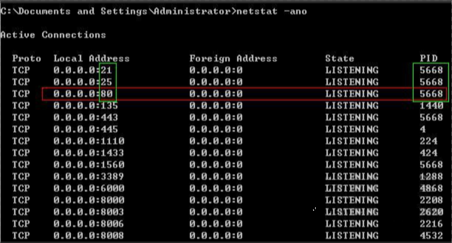 在Windows2000/XP/Server2003中要查看端口,可以使用NETSTAT命令: