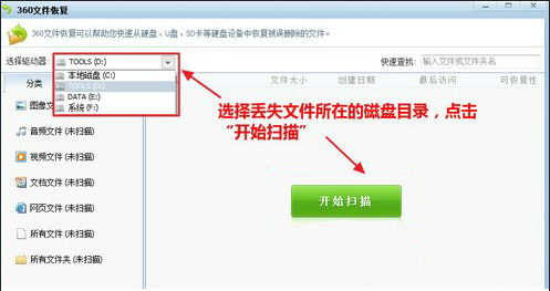 1、打开360文件恢复电脑版,选择需要恢复文件所在的磁盘;如果需要恢复U盘等移动设备的先将U盘连接到电脑上,等待电脑显示“可移动设备”的图标显示即可。接下来点击“开始扫描”,等待磁盘扫描结束。