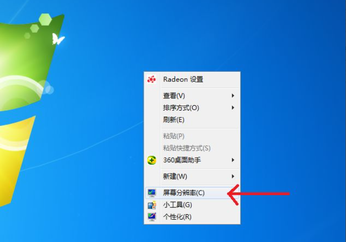 对于这种状况,我们先在桌面空白处单击右键,点选图示箭头所指“屏幕分辨率”。