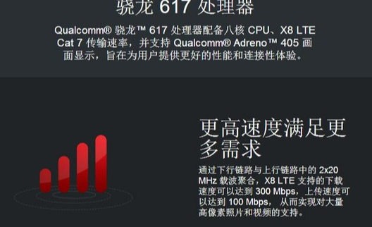 骁龙617为64位处理器,八颗Cortex A53核心,采用28nm制程,主频1.2GHz,整合了GPU Adreno 405 ,集成处理器集成X8 LTE调制解调器,支持4G LTE、 全网通、双卡双待。其稍显优势的地方在于支持Cat 7网络标准(上行300Mbps、下行100Mbps),双向2x20 MHz载波聚合。最高支持933MHz内存。这些在今天看来已经非常过时,但是放在5.6年前这确是旗舰机的存在!