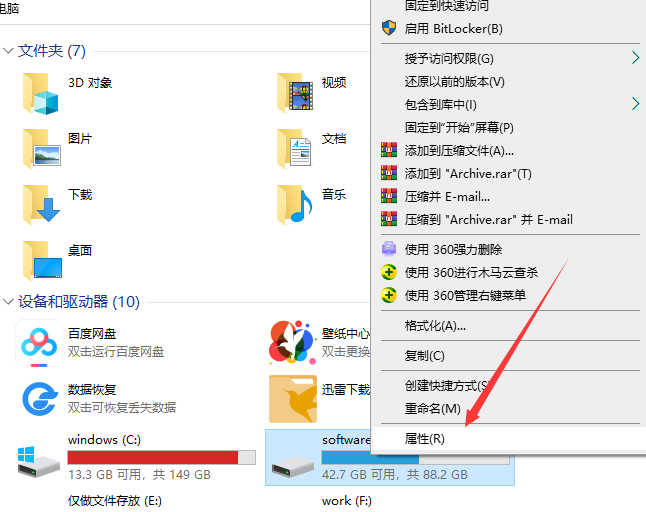 1、有些朋友可能说我们打开管理员权限了,但是还是打不开一些文件。这时候就右击无法打开的盘符或是文件夹,选择“属性”