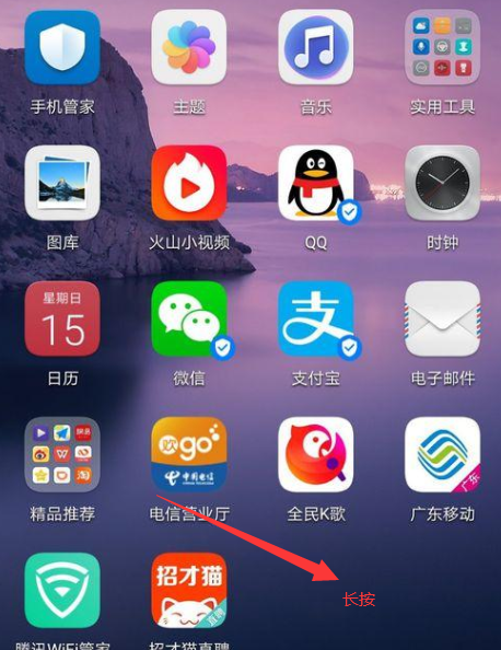 1、点住并长按手机桌面的空白处或者用两根手指在屏幕上从左下角方向和右上角方向向屏幕中央滑动。