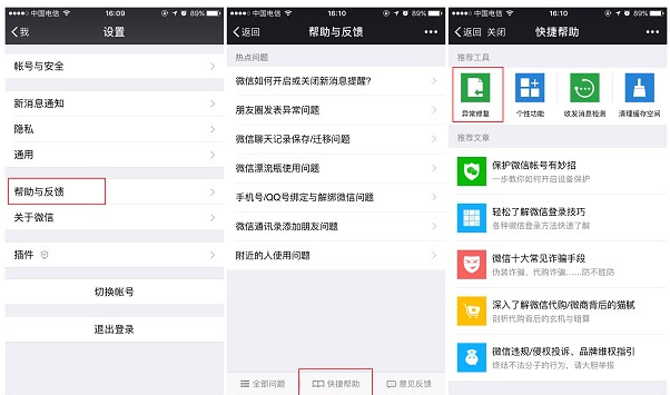 打开微信设置-帮助与反馈-快捷帮助-异常修复,提示你此操作仅对异常闪退或卡死造成的聊天记录、通讯录等功能记录丢失或异常进行数据恢复。