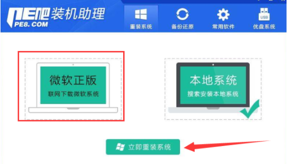 1、打开下载好的PE吧装机助理,点击微软正版系统,下载win10系统后点击立即重装系统。