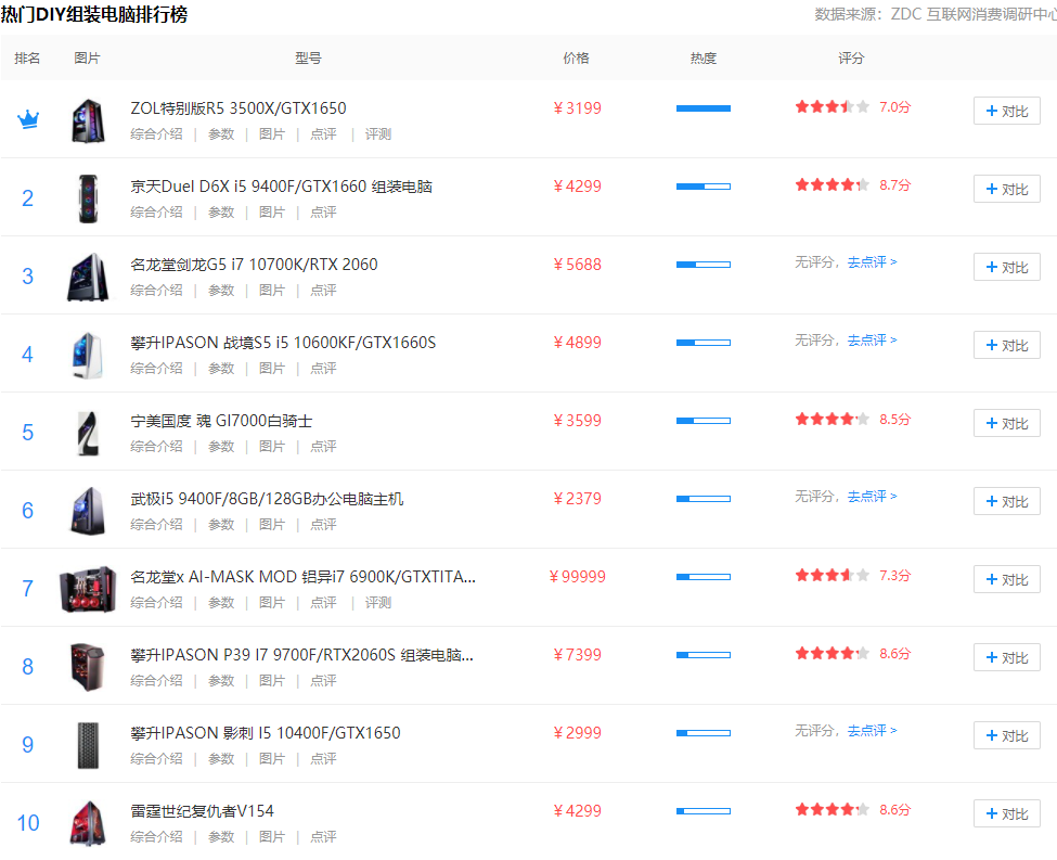 以下是zol最新的2021组装电脑排行榜单前十: