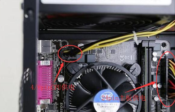 检查电源上4/8pinCPU供电和24pin主板供电是否有插好。很多人在安装好电源、主板后,24pin主板供电插好后,却忘记了CPU供电。这个也是很多小白容易疏忽的地方。(操作过程中请拔掉主机电源线)