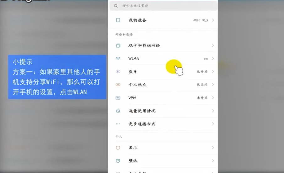 1、如果家里其他人的手机支持分享WiFi,那么可以打开手机的设置,点击“WLAN”。