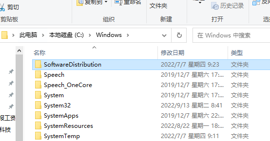 2、打开C:\Windows,重命名SoftwareDistribution文件夹为SDold。