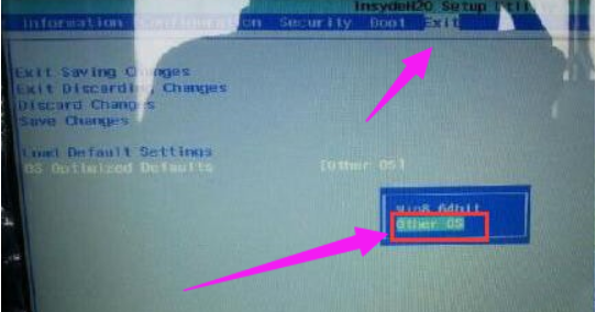 1、按开机键,等待开机画面出现时按f2进入bios,点击Exit,把OS optimized Defaults里默认Win8 64bit改成Other OS。