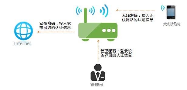 使用无线路由器时,涉及的密码有三个:无线密码、路由器管理密码、宽带密码,各密码的作用如下图所示: