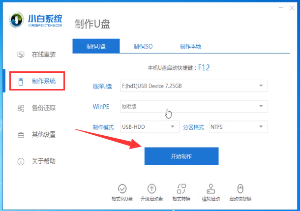 1.把空的U盘插进电脑,打开小白一键重装系统软件,关闭杀毒工具(包括360安全卫士),等小白探测环境完成,点击制作系统,【开始制作】。