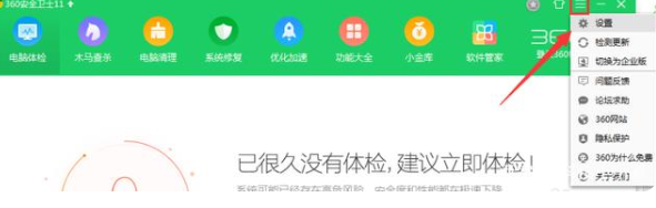 1.打开360安全卫士,进入主界面,点击右侧三横的按钮,在菜单栏中点击设置进入【下一步】。