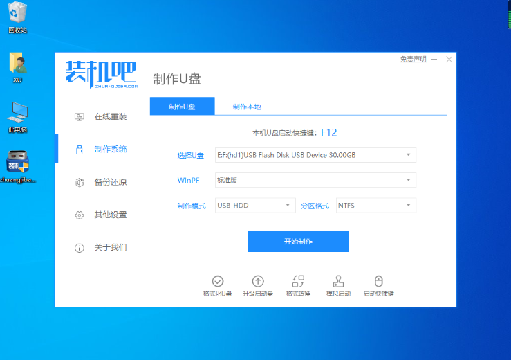 1.首先插入U盘,打开装机吧一键重装系统软件,直接选择开始制作在制作系统页面当中。