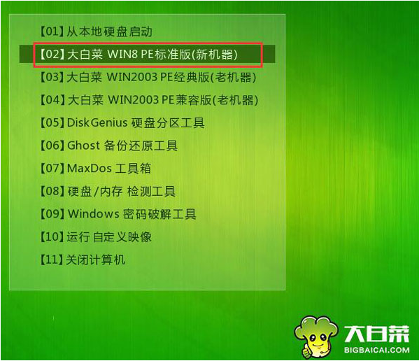 1、将事先制作好的大白菜u盘插入电脑USB接口,然后重启电脑,在出现开机画面时按 F12 或一些其它常用的 Esc 或 Del、F2 之类的启动快捷键进入u盘启动进入PE选择界面,选择“【02】大白菜win8标准版(新机器)”回车键,进入pe系统桌面。
