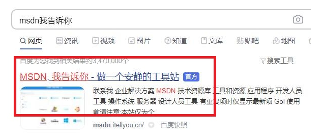 1、在百度网页搜索msdn我告诉你”,搜索出来的第一个就是官网地址,可以看到很明显的“官方”两字。