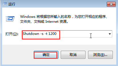 Step1:使用“Win+R“快捷键打开运行窗口,输入”Shutdown –s –t 1200“,点击”确定“(注意:”-s“和”-t“前面均有一个空格;数字”1200“代表的是20分钟,即一分钟按60秒换算)