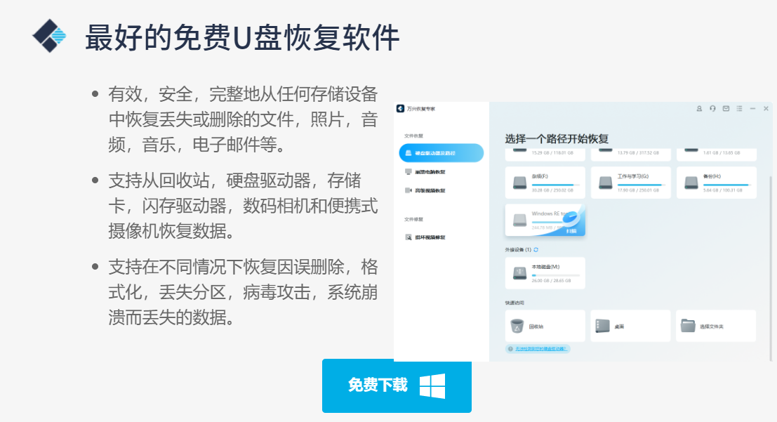 万兴恢复专家是万兴科技公司研发的一款专业数据恢复软件,这款U盘数据恢复软件免费版本可恢复最多100 MB的数据。用户可以快速恢复所有已删除的文档,照片,音乐,视频等内容。该软件可以在所有主流的Windows系统平台上使用,而且软件还推出了Mac版本,苹果电脑用户也同样适用。