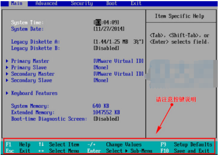 1、开机或重启后进入bios界面,需要记住界面底部的快捷键。