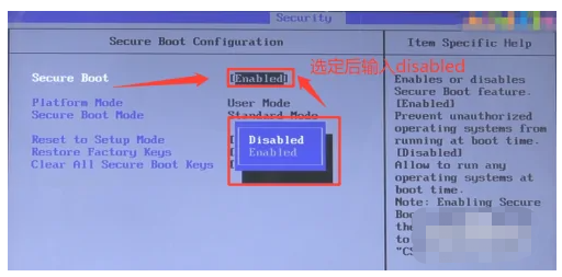 3、跳转至SecureBoot界面后,选定后置代码输入“Disabled”的代码,然后返回“Security”界面。