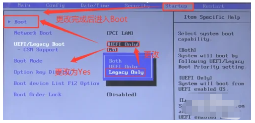 4、使用方向键“→”移动到“Starup”界面,如图所示的步骤操作,将“No”改为“yes”后选中Boot项进入新界面。