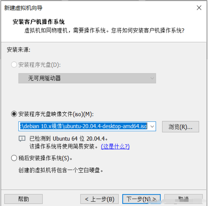 3、然后勾选安装程序光盘映像文件选项,路径为ubuntu系统映像文件所在的文件夹,进入下一步。