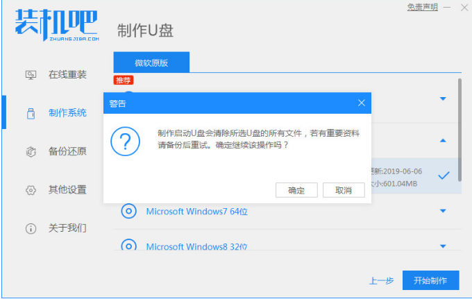 3、当出现提示框,确认U盘内资料全部备份好之后,点击开始制作。