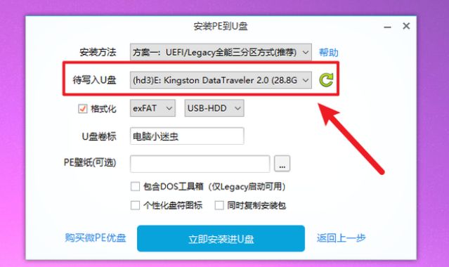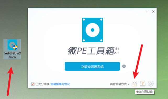 将U盘插入电脑,开启微PE软件(其它PE软件操作类似),选择左下方“其它安装方法”里的第一个“安装PE到U盘”。