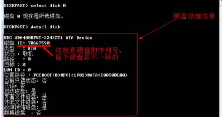 5、选好要查看的硬盘后,接着输入detail disk,硬盘的信息将会全部展现出来