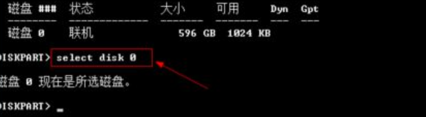 4、输入select disk 0 ,选择刚刚罗列出来的硬盘序号;