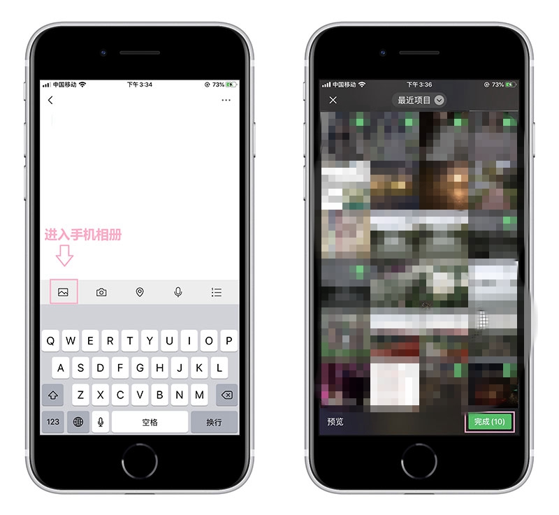 2、随后进入新建笔记界面,点击键盘左上方的相册按钮,将会打开手机相册,选择自己需要长截屏的图片,一次最多可以添加30张,然后点击「完成」。