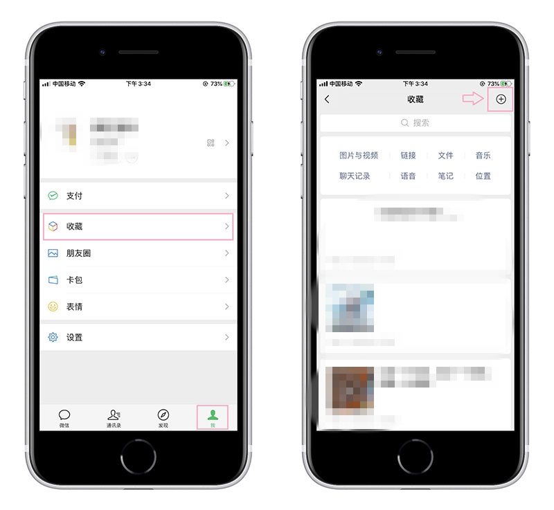 1、苹果手机截屏,首先打开微信,点击右下角的「我」-「收藏」,接着点击右上角的“+”号。
