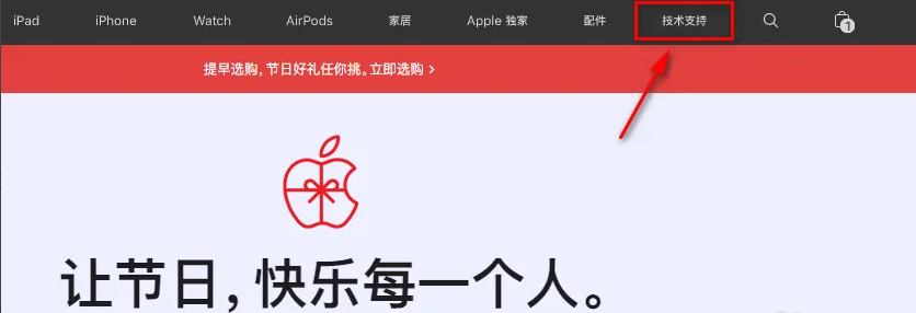 1、首先在电脑浏览数搜索并进入到苹果官网首页,点击【技术支持】功能。