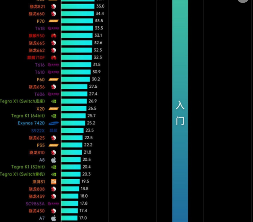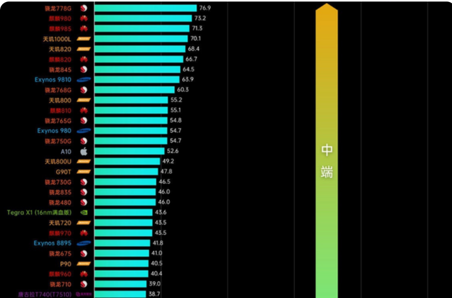 下面就是目前最新手机CPU性能排行榜,手机处理器天梯图。