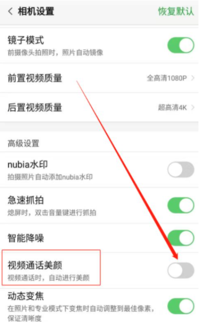 4、找到视频通话美颜一栏,点击后方的开关按钮开启即可。