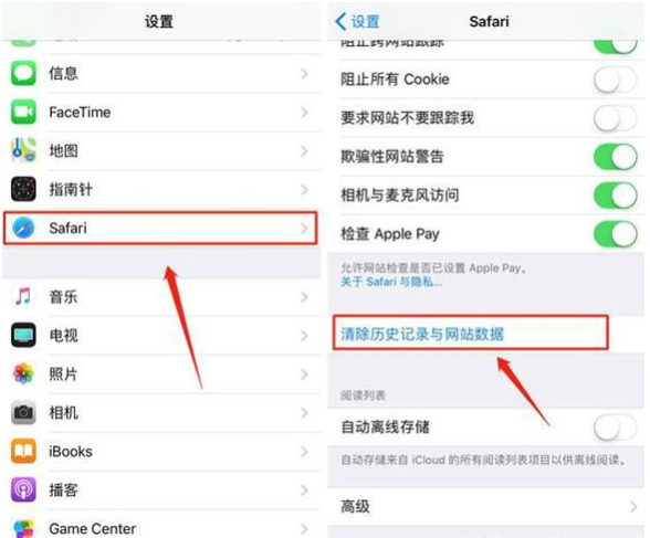 在【设置】的页面当中,点击【safari浏览器】进入属性页面,选择下方的【清除历史记录与网站数据】等待手机完成清理。
