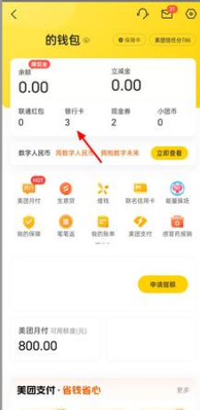 3、进入钱包之后我们可以看到银行卡选项,点击进入。