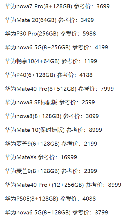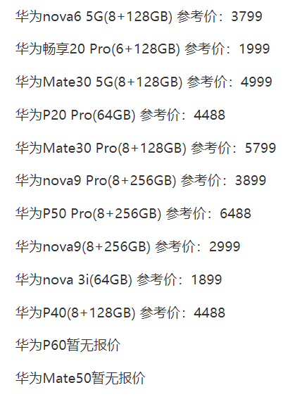 华为手机价格大全2022最新